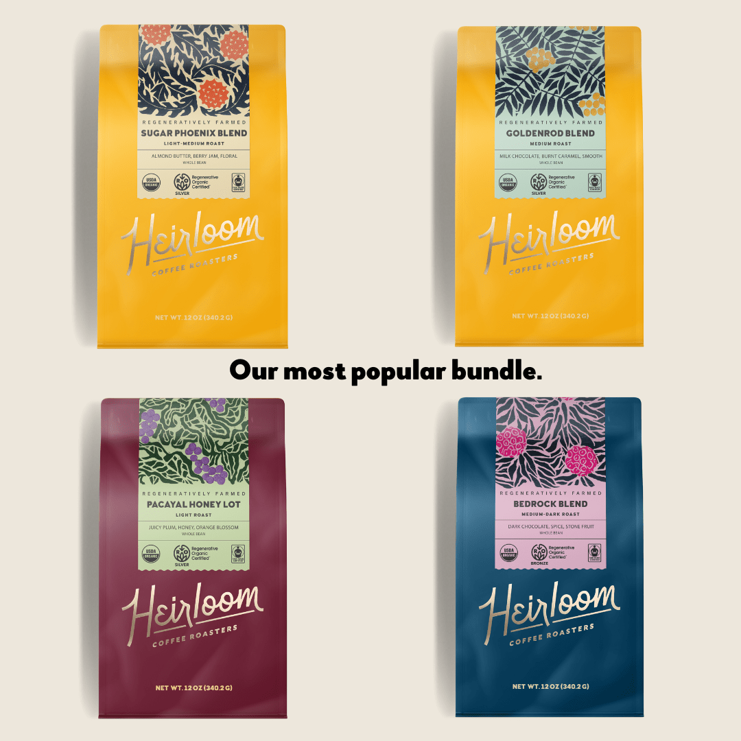 Explore our most popular coffees in our Most Popular Set featuring three of our most popular coffees: Sugar Phoenix Blend, Goldenrod Blend, Pacayal Honey Lot, Bedrock Blend.