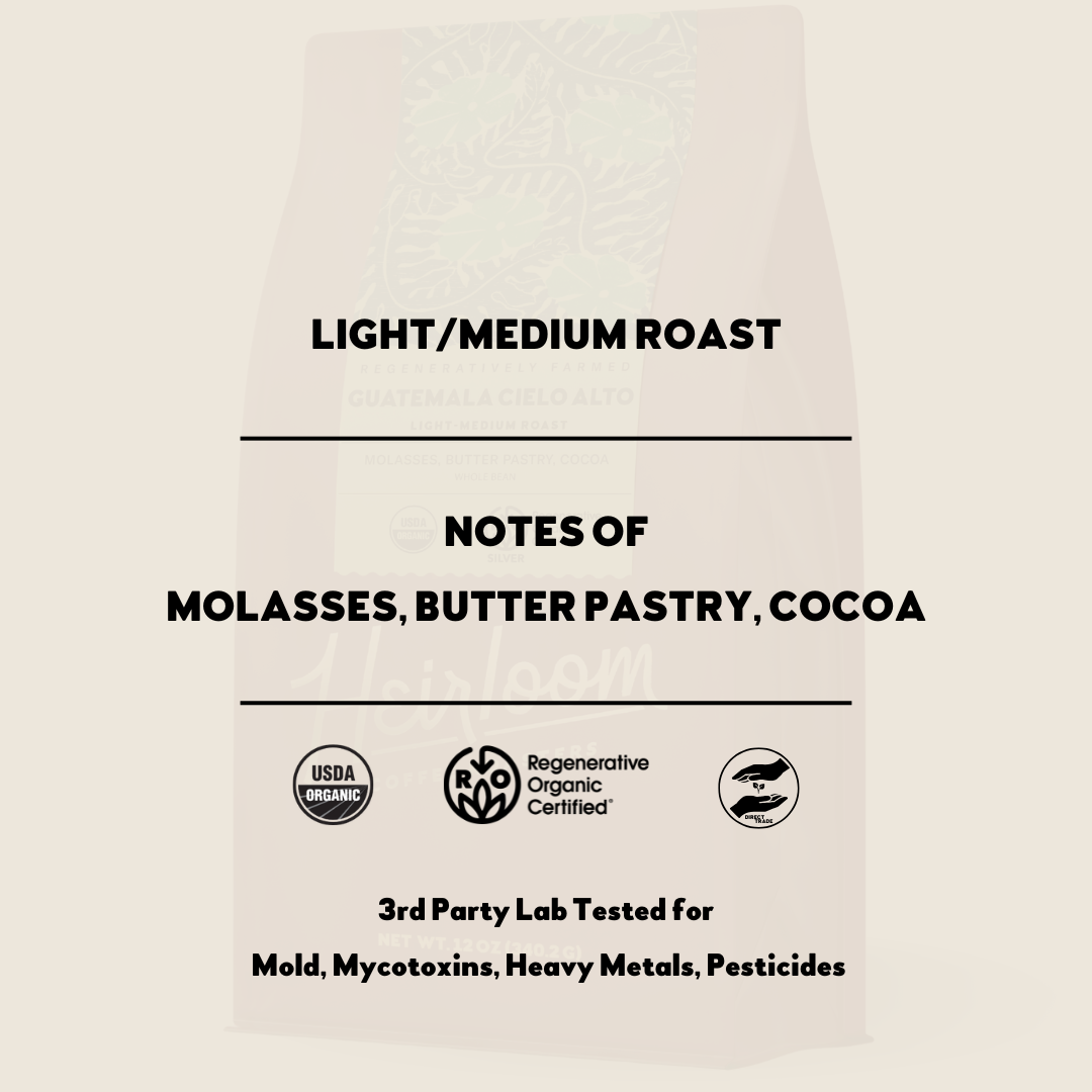 Crafted using The Culinary Roast™ and sourced exclusively from 100% Regenerative Organic Certified farms, Cielo Alto is a unique cup of coffee that delivers flavor and body like nothing else.
